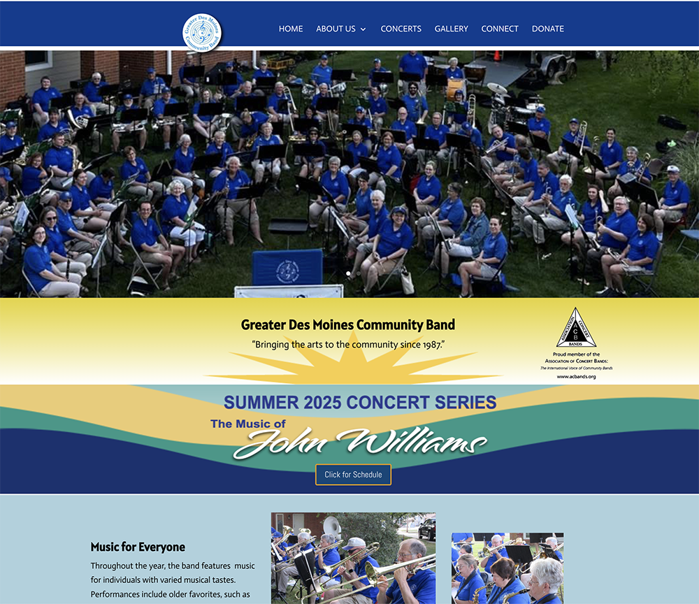 The Greater Des Moines Community Band is an all-volunteer organization that started in 1987. The website includes key elements of the band’s outreach, from its history to concerts. It also includes members-only access that provides a platform for scheduling and board communication.